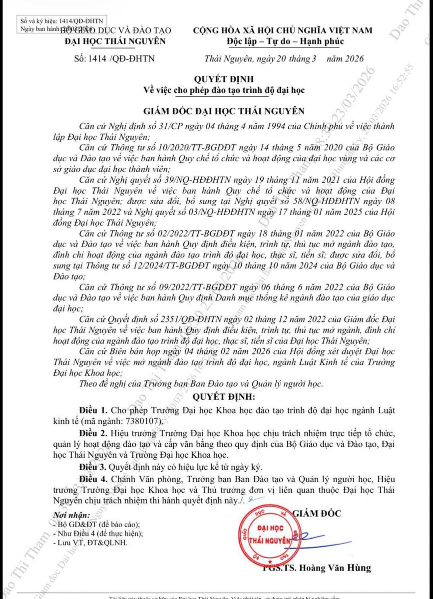 Căn cứ theo Quyết định số 1414/QĐ-ĐHTN do Giám đốc Đại học Thái Nguyên ký duyệt, Trường Đại học Khoa học trân trọng thông báo: ngành Luật Kinh tế (mã ngành: 7380107) đã chính thức được đưa vào danh mục đào tạo của Nhà trường.